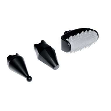 - Das Modular-Set, bestehend aus Oval-Aufsatz, Gripmodul, Noppenmodul und Triggermodul, wurde speziell für die Anwendung bei Tieren entwickelt. Die unterschiedlichen Oberflächen ermöglichen eine individuelle Anpassung der Stimulationsreize an das jeweilige Behandlungsziel und die Bedürfnisse des Tieres.